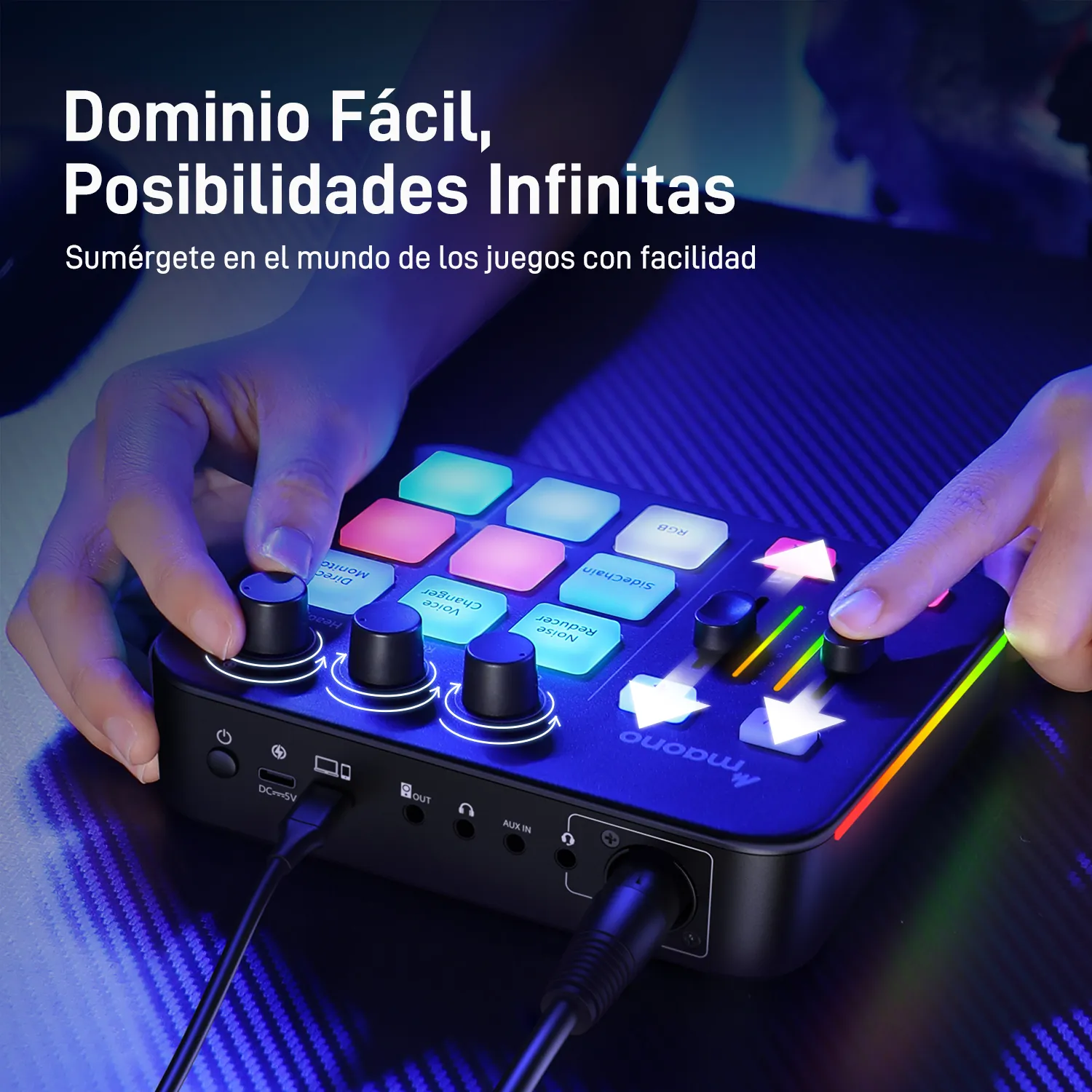 MEZCLADOR DE AUDIO PARA STREAMING GAMER*ILUMINACINO RGB*ENTRADA XLR*BLUETOOTH*AURICULARES*SILENCIO A 1 CLICK*ALIMENTACION PHANTOM 48V*EFECTOS DE SONIDO*
